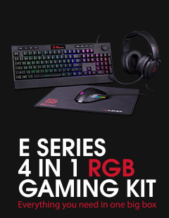 The E SERIES 4 in 1 RGB GAMNG KIT provides a one-stop solution to meet all your gaming needs. The keyboard uses gaming grade switches for ultimate responsiveness and is equipped with 16.8 million RGB colour illumination with 11 stunning lighting effects. The headset contains high quality 40mm drivers for impeccable sound, as well as featuring an auto adjusting headband and a microphone. The mouse uses a gaming grade optical sensor reaching up to 7200 DPI, plus side panel lighting with 16.8 million colour options and 13 different lighting effect settings. Finally, the mousepad is made from a textured weave and offers for superior mouse movement so you can pull off all those clever flick shots.