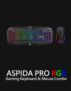 The ASPIDA PRO RGB Gaming Keyboard & Mouse Combo is a budget friendly combo packed with amazing features. The keyboard frame is reinforced and designed for durability; it comes with 6 zones RGB backlight configured with 8 lighting effects. It also has multiple keysets that are able to be controlled on-the-fly for convenience. For the mouse, it has an optical sensor of up to7200 DPI, with a 10-million click lifespan, and is ergonomically shaped to serve for maximum comfort.